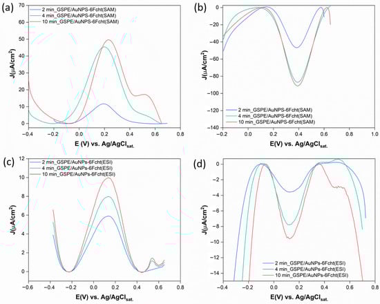DPV measurements of GSPE surfaces functionalized with AuNPs at different HAuCl4 deposition times, modified with 6Fc-ht through the SAM procedure (a,b) and ESI microdroplets deposition technique (c,d), performed in KCl 0.1 M, EDC = 0.215 V, EAC = 0.01 V, νmax = 100,000 Hz, and νmin = 0.1 Hz.