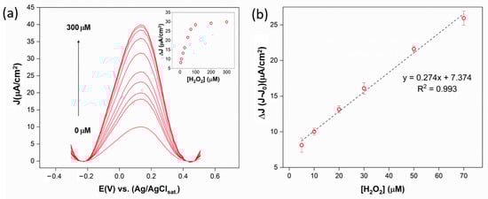 (a) DPV curves collected in the absence and presence of increasing concentrations of H2O2 in the range 0–300 μM in PBS 0.01 M, KCl 0.1 M. In the inset are reported the ΔI (I-I0) over the analyzed H2O2 concentration range; (b) sensor calibration line.