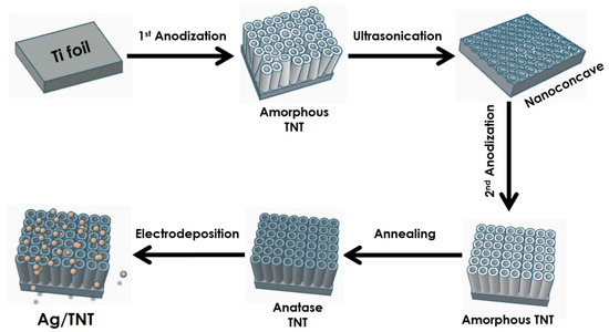 Schematic representation of the process for synthesizing Ag NP-electrodeposited TNT photocatalysts.