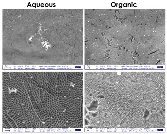 Field emission scanning electron microscopy (FESEM) was used to analyze the starting morphologies of the photocatalysts. The top-view FE-SEM images of the photocatalysts (i.e., those that have not undergone any photocatalytic cycles) show the formation of highly ordered and regular nanotube arrays on the titanium substrate surface. In both electrodeposition conditions, silver was deposited both in the form of nanoparticles, as desired, and in larger aggregates, with more irregular shapes when an aqueous supporting electrolyte was used, and more rounded ones with the organic electrolyte (Figure 2). Yet, in the former case, at the nanoscale, the NPs appeared to be more uniformly distributed in and around the TNT mouth, with sizes ranging roughly from 40 to 100 nm (Figure 2, left). Na2SO4 improved the electrolyte conductivity during the deposition process, leading to a more uniform deposition of Ag NPs and preventing the clogging of Ag NPs that might accumulate at the mouths of the nanotubes during electrodeposition [22]. The Ag nanoparticles derived from the organic electrolyte (Figure 2, right) exhibited slightly larger sizes—ranging this time from 50 to 140 nm. Some nanotubes were completely closed because of the deposition of bigger nanoparticles. Ag NPs typically aggregate because of the charge differences among Ag NPs of different sizes, where smaller ones have a partial positive charge and larger ones have a partial negative charge: as a result, via the conductive substrate, larger nanoparticles tend to absorb nearby smaller particles [23,24]. The mass fraction of silver on the specimen surface was calculated instrumentally through EDX maps sampled on the representative oxide surfaces, with an approx. size of 50 μm2. The silver fractions differed from sample to sample, consistent with the SEM images shown in Figure 2 and indicating non-optimal and non-uniform Ag distribution and formation of the agglomerates. Specifically, they were calculated to be 1.8% on sample A_UC, 2.6% on sample O_UC, and 2.7% on sample O_C.