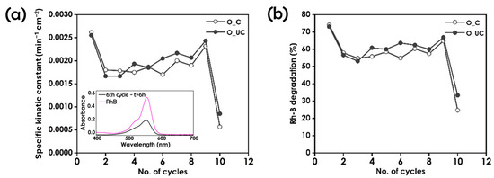 The apparent reaction-rate constant (k) represents the photocatalytic activity, C0 is the initial concentration of Rh-B, and C indicates the concentration of Rh-B for different degradation times. Figure 3a shows comparative studies of the specific rate constants (the apparent reaction rate constant divided by the specific area of the photocatalyst) of the O_C and O_UC photocatalysts for all 10 photocatalytic cycles, while the photocatalytic degradation efficiency in 6 h of testing is reported in Figure 3b. Interestingly, despite the first 30% drop in photoactivity after the first use, which may be explained by partial intermediate adsorption onto the surface, in the following cycles, the photocatalyst gradually recovered its initial efficiency. The effective breaking of the conjugated structure of the RhB molecule, and thus, the effectiveness of the photocatalytic process, was confirmed by the decrease in intensity in the absorbance spectrum (inset in Figure 3a), with no peak shift, which could have indicated discoloration rather than molecule degradation. However, at the 10th cycle of use, the photocatalytic efficiency dropped significantly, indicating clear deactivation.