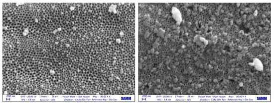 In contrast, for the O_C and O_UC photocatalysts, their stability was compromised after nine cycles, despite the apparent absence of morphological changes (data not reported). The reasonable explanation for the drastic reduction in photoactivity could be either the deactivation caused by the reaction byproducts adsorbed on the photocatalyst surface, or the structural collapse. The SEM results support the explanation suggesting deactivation, as there were no relevant morphological changes with respect to the pristine conditions. Indeed, the surface of the nanotubes appeared less clean, with shadows on top of most nanotubes that may indicate the presence of organic residuals.