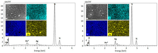 Further analyses using other characterization techniques were conducted to study the elemental composition of the adsorbed contaminants. After ten photocatalytic cycles, EDX analysis was performed (Figure 6). According to the EDX data, the elements that were most common on the surface of the photocatalysts were titanium (Ti), oxygen (O), and silver (Ag). Furthermore, residues of impurities like carbon and nitrogen were found, deriving from Rh-B residues. Although the elemental mapping shows Ag dispersed apparently uniformly over the TNT surface for each photocatalyst, with increased intensity where white particles are observed in the SEM image, this is due to the limited spatial resolution of the EDX probe. Indeed, Ag was concentrated in the nanoparticles, and not present where particles are not visible.
