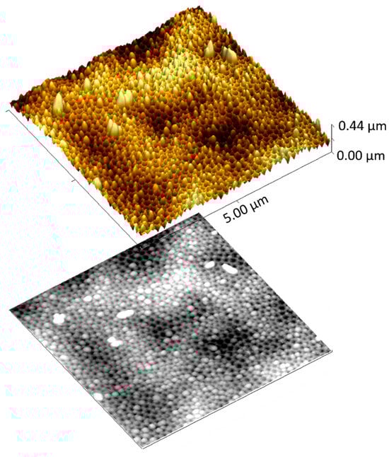 To better highlight this correlation, Figure 11 reports the AFM (panel (a)) and Raman spectroscopy (panel (c)) overlapping (panel (b)). As previously mentioned, it can be seen that where more round-shape features are present, i.e., Ag particle clusters, there is a brighter area in the Rh-B Raman intensity map.