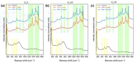 Immediately after the very first cycle (see above for details), the main spectroscopic features of TiO2 were significantly reduced in intensity, while new intense peaks appeared at 1195 cm−1, 1280 cm−1, 1355 cm−1, 1500 cm−1, and 1640 cm−1,, and other less intense at 630 cm−1, 760 cm−1, and 930 cm−1, all corresponding to the presence of Rh-B, as also reported in the literature [28,29]. By increasing the number of cycles by a factor of 10, the Raman spectra results were unaffected even though some samples (O_C_10) were washed after being used in the photocatalytic water treatment. We only observed an insignificant change in the spectrum background. This confirms that the washing procedure adopted between one photocatalysis cycle and the other was pointless and did not allow the residuals of Rh-B to be cleaned from the sample.