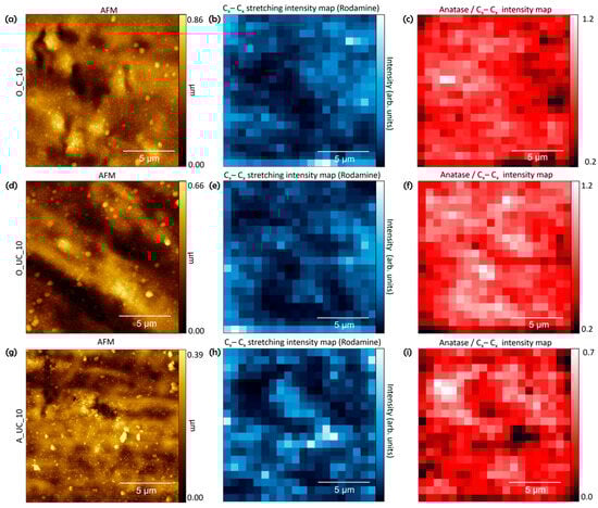 Morphological maps [(15 × 15) μm2] are reported in panels (a,d,g), for O_C_10, O_UC_10, and A_UC_10, respectively. In the same region, the Raman intensities for Rh (namely, the Cx–Cx stretching mode, about 1640 cm−1) are reported in panels (b,e,h). The anatase contribution (144 cm−1) map is shown in panels (c,f,i).