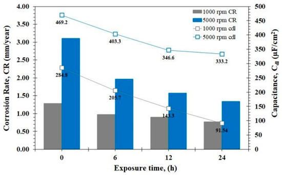 - The analysis of EIS revealed that there was an increase in CR of almost double at 5000 rpm with respect to the 1000 rpm system, Cdl showed a behavior directly proportional to CR.