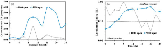 - Statistical analysis of EN indicated that localized attack was more severe as rotation rate increased from 1000 to 5000 rpm. SEM micrograph confirmed this fact, the attacked metal surface showed a localized corrosion process, with deep pits nucleating, and greater wear was observed at 5000 rpm due to turbulent flow and shear stress.
