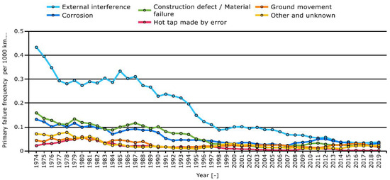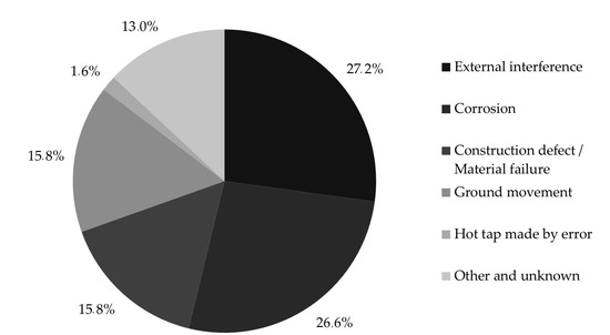 The latest report by the European Gas Pipeline Incident Data Group (EGIG) identifies corrosion as a leading cause of accidents, as well as external interference (Figure 1). Unlike external interference, however, corrosion does not show a downward trend, and its impact on accidents is likely to become even more significant in the future [23]. Consequently, most studies on pipeline reliability and failures currently focus on or relate to corrosion, not only due to the risk of accidents but also because it reduces the time between maintenance intervals, as well as the useful life and reliability of the system [24,25].