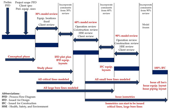 Barker [27] presents a logical design diagram (Figure 2). It shows that, before the development of the plot plan, project input data and project design data must be established. Project input data can be classified into three categories: project design data, supplier data, and internally generated engineering data. Additionally, engineering companies and clients typically use Process Industry Practice (PIP) plant layout design specifications that must also be met.