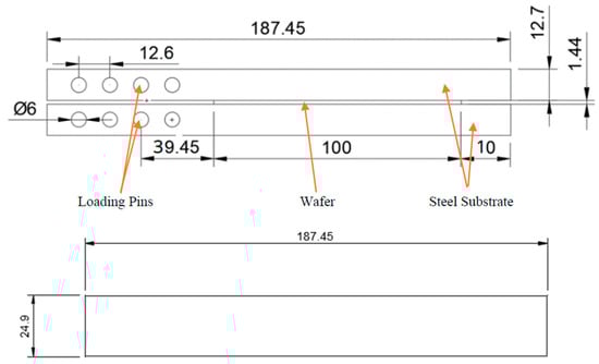 In consideration of the DCB testing setup in universal testing machines, the width and length dimensions have been thoughtfully pre-selected to ensure compatibility, and the holes incorporated into the steel bars serve the purpose of applying load to the wafers via loading pins. The technical dimensions of the DCB and the loading pin reference point can be seen in Figure 2.
