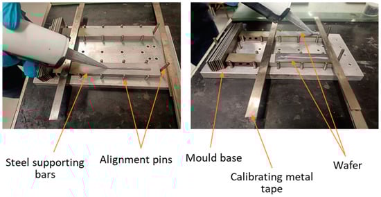 The mold consists of two aluminum plates with small holes designed for inserting pins to secure the DCBs in position. Nevertheless, given the short length of the steel bars employed in the DCB assembly, it is imperative to incorporate spacers behind them to ensure a snug fit onto the mold. Not only that, but tapes also (with the wafer height) were positioned on the extremities of the wafer to ensure a more compact fit of the weights during the curing process.