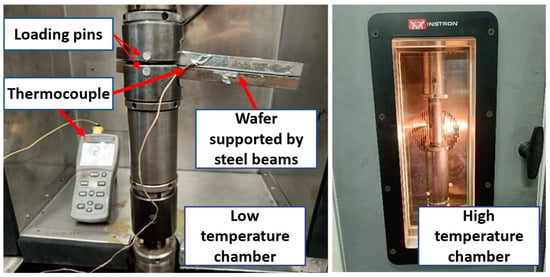 Additionally, numerical simulations using CZM allowed for a deeper understanding of damage propagation and interface behavior. By employing an inverse contact CZM approach, numerical simulations were matched with experimental data, determining this way the cohesive properties of the interface under study. For room temperature testing, the results showed an initial cohesive stiffness of 720 MPa/mm and a maximum traction of 31 MPa. For low temperature, these parameters are 650 MPa/mm and 48 MPa for the stiffness and traction, respectively. And last, for high-temperature testing, the findings were 1200 MPa/mm for the initial stiffness and 120 MPa for the maximum traction. As the results show, a linear relationship of fracture energy with temperature was not observed, as the fracture energy at room temperature was lower than at low and high temperatures. It should be noted that thermal stresses in the tested wafers may significantly contribute to the failure mechanism and mechanical properties.