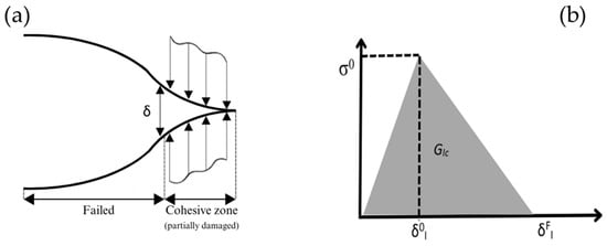 (a) CZM visual approach and (b) CZM traction separation curve.