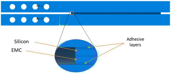 According to the literature, silicon properties’ variation with temperature can be ignored [25]. As for the EMC, the variation in its properties with temperature relies heavily on its composition. EMC is a composite made with epoxy and fillers, and if, for instance, its ratio changes from producer to producer, it is hard to tell how the variation in its properties with temperature may occur [21,26]. Although there is strong evidence that with higher temperatures, EMC’s Young’s modulus decreases, this variation did not significantly affect the numeric simulations.