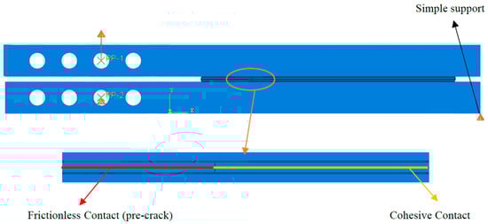 To simulate the displacement applied through the loading pins, the y-axis displacement was set to 1.5 mm, while the other two axes were not constrained. The simple support only had the y-axis displacement constrained. These conditions restrict the model’s y-directional movement and bottom bar rotations. A visual representation of each boundary condition in the DCB can be seen in Figure 7.