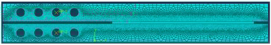 In order to obtain a simple but refined mesh, a global mesh with a medium density of 0.1 mm was applied in the entire wafer, and a local mesh with a maximum element size of 3 mm and a minimum element size of 0.1 mm was used along the steel bars. The DCB’s mesh geometry can be observed in Figure 8. All the mesh element types are 4-node bilinear plane stress.
