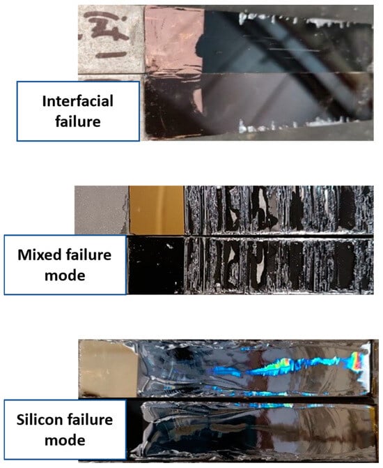 Considering the experimental results, it was discovered that the crack did not always propagate exclusively at the bi-material interface but instead partially or entirely through another layer of the tested wafer. Consequently, the results may vary according to their corresponding failure mechanisms, which include interfacial failure (when the crack propagated through the bi-material interface), silicon failure (when the crack extended into the silicon layer of the wafer), and mixed failure (when the crack simultaneously propagated through the bi-material interface and the silicon layer); see Figure 9. It is worth noting that the weakest part of the joint is the one to which the crack will extend.