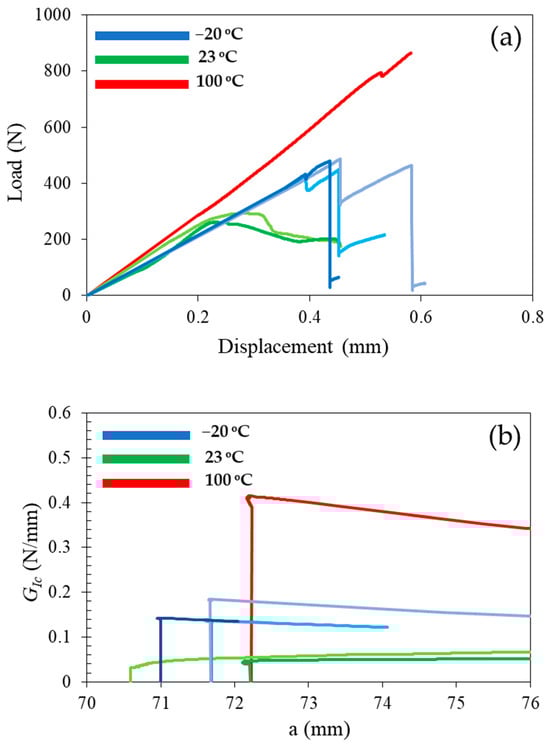 The experimental results shown in Figure 10a,b are load–displacement and R-curves for six specimens at three different temperatures. As for Table 3, the results presented for the room temperature are a mean of two tests carried out during the experimental procedures; the low temperature values shown were obtained from a mean of three experimental tests conducted, and for high temperature, only one result was obtained.