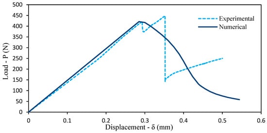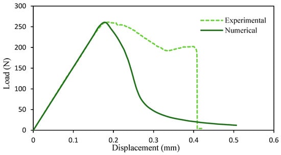The numerical simulation for the room temperature curve gave us a good approximation, with a maximum experimental load of 260 N and a fracture energy of 0.051 N/mm, as can be seen in Figure 11. The CZM parameters obtained were 720 MPa/mm for the initial stiffness and a maximum tensile strength of 31 MPa.