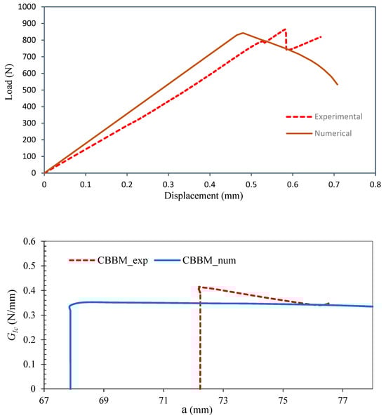Three parameters are required to conduct a triangular CZM analysis (Figure 5b): fracture energy, initial stiffness, and maximum traction. The GIc was obtained experimentally; as for the other two, an inverse cohesive contact method was utilized, where values for maximum nominal stress and initial stiffness were applied until the numerical and experimental load–displacement curves matched.