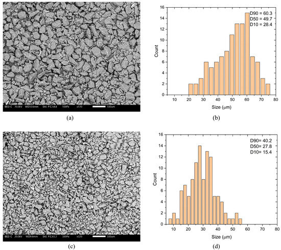 The SEM images of the two powders differently sieved are reported in Figure 1a and Figure 1c, respectively, and for both images, the size distribution of the powders, determined with the aid of ImageJ software, was extracted (Figure 1b,d). The particle size was measured considering the maximum dimension of the particles. As a result, elongated particles with a major dimension larger than the sieve aperture may still pass through it due to their shape. However, the dimension of the maximum dimension for 90% of the particles (D90) for the coarse powder, 60.3 µm, indicates that nearly all granules are smaller than the sieve aperture size (63 µm). For the other type of powder, D90 is calculated at around 40.2 µm.