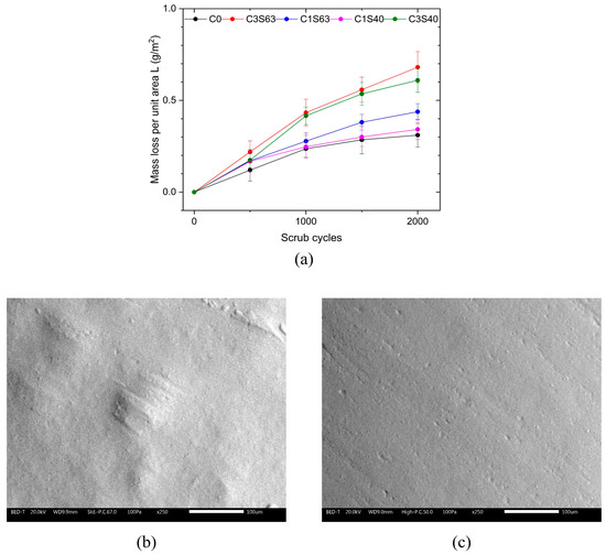 Mass loss evolution during 2000 cycles of the Scrub test (a). SEM-BED images (b) and (c) highlight the different roughness morphologies on the tested coating surface for C3S63 and C0 samples, respectively.