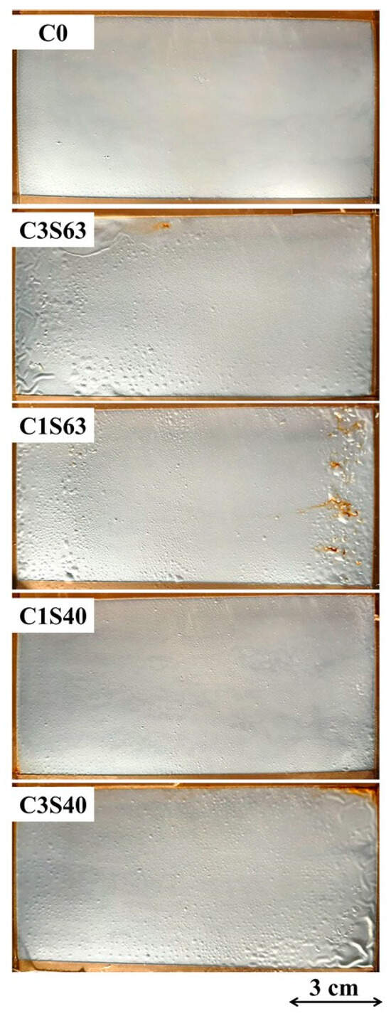 Furthermore, the comparison between C3S63 and C3S40 underscores the impact of particle size. Larger particles appear to exacerbate water absorption, potentially creating pathways that facilitate water transport through capillary action. Meanwhile, for the samples containing 1 wt% of particles, it is observed that the blistering is less noticeable, and the effect of particle size is less pronounced. The barrier properties of the composite layers are weakened by the presence of these fillers, as their interface with the polymer matrix creates pathways that allow moisture and aggressive ions to penetrate. Larger particles, due to their hydrophilic nature and increased likelihood of surface exposure with incomplete matrix coverage (see Figure 2), create preferential pathways for electrolyte infiltration. This effect, combined with the expanded interface between the polymer matrix and the filler, promotes higher water uptake and reduces the overall barrier performance of the coating. Similar behavior has been reported in previous studies [6], where lignocellulose-based fillers increased water absorption by forming percolating pathways that facilitate water transport through capillary action within the filler.
