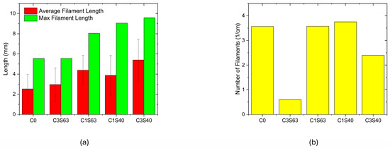 FFC degradation parameters after 500 h of humidostatic test at 80 r.h.% and 40 °C. (a) reports the mean and maximum filament length, while (b) displays the specific number of nucleated threads per unit length.