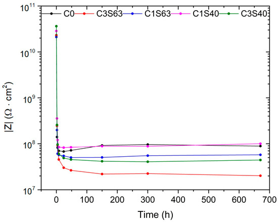 EIS monitoring during electrolyte immersion is commonly employed to evaluate the protective performance of paints, including their adhesion properties, barrier properties, and potential defects. The impedance modulus in the Bode plot at low frequencies (10−2 Hz), denoted as |Z|(0.01), in some cases, could serve as a key parameter for approximating the overall coating’s level of protection. This is commonly recognized as a potential source of misinterpretation in the case of organic coatings with a high level of barrier properties [42]. However, in the present study, the waterborne nature of the paints and the increased permeability introduced by the addition of Tagua powder provide suitable boundary conditions for a reliable evaluation of these parameters as a representative index of the coating’s protective performance. According to various authors [43,44], a |Z|(0.01) value of 106 Ω·cm2 is generally considered the minimum threshold for classifying a coating as “protective”. The performance of the coatings was assessed by monitoring the evolution of their impedance modulus, |Z|(0.01), over time. The results, depicted in Figure 8, show the variation in |Z|(0.01) throughout the 670 h exposure to the test solution. Initially, all samples exhibited similar values for |Z|(0.01) around 1010 Ω·cm2. In the following 8 h after, the low-frequency impedance continues to decrease significantly reaching a value around 108 Ω·cm2 for all the samples, and this is due to the water uptake typical of the waterborne paint [45]. This type of coating containing additives like wetting and dispersing agents, stabilizers, and thickeners having hydrophilic characteristics makes the films more susceptible to water absorption. However, after 24 h of immersion, all samples appear to stabilize, with for |Z|(0.01) remaining relatively constant for the remainder of the test. As indicated in the NSST, the presence of Tagua particles in the paint, due to their hydrophilic tendency, leads to a general decrease in the impedance modulus at the end of the test, compared to the paint without particles, which retains the highest impedance modulus. C3S63 shows the lowest for |Z|(0.01) after 670 h of exposure to the electrolyte, while C3S40 containing the same amount of filler shows a higher value, also highlighting this time the negative effect of bigger particles, which favor the formation of detrimental pathways that allow the electrolyte to reach the substrate.