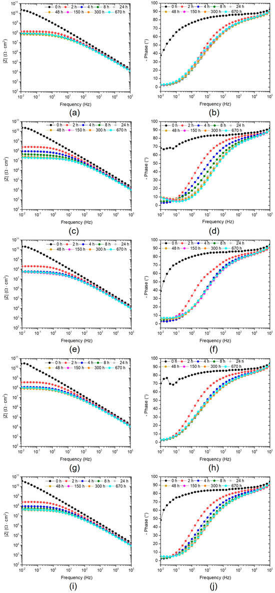 Bode impedance modulus and the Bode phase spectra for C0 (a,b), C3S63 (c,d), C1S63 (e,f), C1S40 (g,h), and C3S40 (i,j).