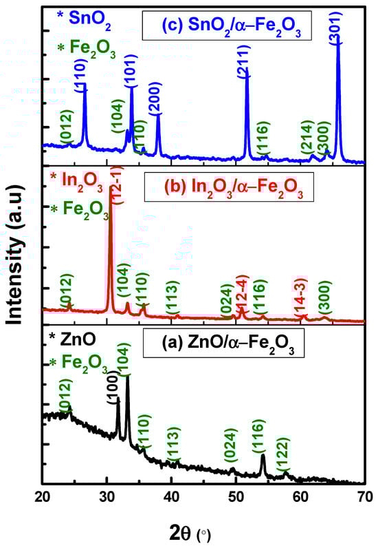 XRD was used to evaluate the crystal phase of the prepared ZnO/α-Fe2O3, In2O3/α-Fe2O3, and SnO2/α-Fe2O3 thin film heterostructures. Firstly, all peaks observed in the crystal structure of ZnO/α-Fe2O3 (Figure 1a) were located at 2 values of 24.3°, 31.4°, 33.4°, 34.9°, 40.6°, 44.5°, 54.2°, and 57.7°, which are related to the (012), (100), (104), (110), (113), (024), (110), and (122) planes, respectively. These peaks indicate the hexagonal phase of ZnO and the rhombohedral phase of the hematite α-Fe2O3 according to the JCPDS card numbers 036-1451 and 01-1053, respectively. These findings are consistent with those of Noukelag et al., who synthesized zincite ZnO and hematite α-Fe2O3 for the first time from an aqueous extract of rosemary [].