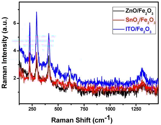 Raman spectroscopy is a dependable method for characterizing materials. It distinguishes various material phases using discrete vibrational modes. The phase type and purity of the material are confirmed using the numerous unique phonon modes revealed in the Raman spectra. Figure 2 shows the Raman spectrum analysis of the ZnO/α-Fe2O3, In2O3/α-Fe2O3, and SnO2/α-Fe2O3 thin film heterostructures. The Eg modes of α-Fe2O3 are represented by the peaks at 243, 292, 404, and 604 cm−1, whereas the A1g modes are associated with the peak at 497 cm−1. These peaks appeared in all the different thin films. These results enhance the production of pure hematite α-Fe2O3 [,,].