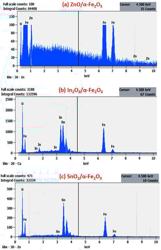 EDXS spectra of (a) ZnO/α-Fe2O3 thin films, (b) In2O3/α-Fe2O3 thin films, and (c) SnO2/α-Fe2O3 thin films.