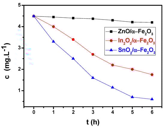 Ultimately, the rate at which the methylene blue (MB) aqueous solution degraded in the presence of sunlight was used to evaluate the photocatalytic activity of the structures based on the obtained thin film heterostructures. The cylindrical batch reactor used in the research was opened to the air. For the photocatalytic tests, methylene blue MB (Aldrich) was selected as the model molecule. A steady stream of water flowing through the reactor maintained the MB solution at room temperature. The starting MB concentration was 4.5 mg/L. To achieve adsorption equilibrium, the MB solution was agitated at a magnetic stirrer for one hour in the dark. Under continuous stirring, the aqueous suspension comprising MB and the photocatalysts of ZnO/α-Fe2O3, In2O3/α-Fe2O3, and SnO2/α-Fe2O3 thin films was exposed to solar radiation. Four analytical samples were taken from the MB solution every 30 min in order to determine the impact of sunlight irradiation. Each sample’s MB concentration was determined using a UV–Vis spectrophotometer.