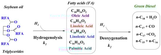 Biofuel is typically produced through the transesterification of vegetable oils []. However, this process generates large amounts of glycerol, which can impact the quality of the final product []. The hydroprocessing of vegetable oils (HVO) can convert the oils into linear chain alkanes, similar to those found in diesel fuels [,]. This process is carried out using heterogeneous catalysts (usually NiMo or CoMo), in a hydroprocessing reactor, at high hydrogen pressures (30–80 bars) and temperatures (320–410 °C) [,]. The main goal of HVO is to convert triglycerides into products compatible with fuel supply and storage systems. HVO proceeds through two consecutive reaction mechanisms shown in Figure 1: hydrogenolysis (k1), which transforms triglycerides into fatty acids (e.g., palmitic linolenic, linoleic, and oleic acids), and deoxygenation (k2), which converts these fatty acids into linear hydrocarbons such as pentadecane, hexadecane, heptadecane, and octadecane (C15–C18) [].