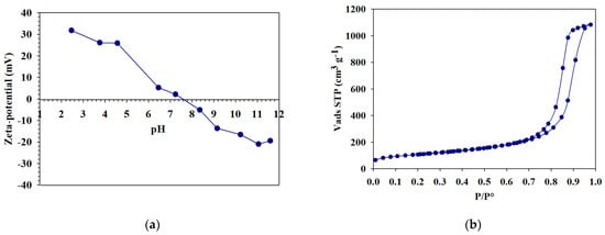 The Al2O3 support was characterized by using zeta potential and N2 physisorption, and the results are shown in Figure 2. The amphoteric character of the Al2O3 surface was analyzed by the zeta potential, Figure 2a. A zeta potential value of zero indicates equilibrium between the solution charges and the surface charge of the support []. At pH values between 2 and 7, the positive zeta potential values observed indicate that the Al2O3 surface possesses a positive charge (Al-OH2+) in the presence of an acidic solution (H+). At pH values between 8 and 12, the negative zeta potential values indicate that the surface becomes negatively charged (Al(OH)2− or AlOO−) due to the presence of OH− ions from the solution [,]. The net surface pH of the Al2O3 support is 7.8, as shown in Figure 2a. This value is comparable to the one reported by []. Based on this, it is suggested that in an impregnation solution at pH = 7, the Al2O3 surface is positively charged, allowing interaction with the negative ions in the solution. In contrast, in an impregnation solution at pH = 9, the surface is negatively charged, favoring interaction with the metallic cations in the solution.
