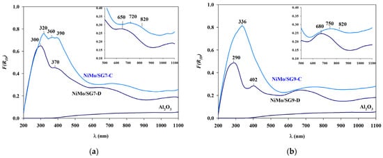 Figure 3 shows the UV-vis DR spectra of the catalysts after the drying and calcination steps. The alumina support shows no bands. A broad band with a maximum at 300 nm is observed in the NiMo/SG7-D catalyst, corresponding to the O2− → Mo6+ charge transfer [], Figure 3a. The band at 370 nm corresponds to the surface species [Ni2+6H2O] []. The 650 nm band is related to the Ni2+(Oh) surface species. According to the zeta potential results at pH = 7, the alumina possesses a positive surface charge (+2 mV), which is sufficient for the deposition of ions.