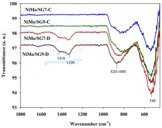 In the supported metal oxide catalysts, spectroscopy analysis provides complementary information regarding the surface species formed []. FT-IR spectroscopy allows the analysis of the vibrational modes associated with chemical interactions within the catalyst structures [], particularly the vibrations of the terminal Mo=O and bridging Mo-O-Mo. The FT-IR spectra of the NiMo/SG7 and NiMo/SG9 catalysts after the drying and calcination steps are shown in Figure 4. All catalysts show a band at 540 cm−1, associated with the vibrations of Mo-O-Mo bridges []. Additionally, all samples exhibit a wide band between 820 and 1000 cm−1, which is associated with the Mo=O and Mo-O vibrations of surface metal oxide species []. Both dried samples, NiMo/SG7-D and NiMo/SG-9-D, exhibit two broad bands at 1320 and 1410 cm−1, corresponding to ionic nitrates from the precursors []. After calcination, these bands are no longer detected in the NiMo/SG7-C and NiMo/SG9-C samples.