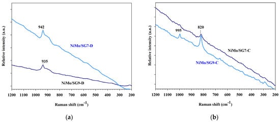 Catalysts were also characterized by Raman spectroscopy, as shown in Figure 5. The NiMo/SG7-D catalyst shows a band at 942 cm−1, corresponding to the Mo=Ot vibration of the Mo7O246− species [,,], as shown in Figure 5a. This suggests that the positive charge of Al2O3 during the impregnation at pH = 7 facilitates the adsorption of these species. The NiMo/SG9-D catalyst shows a band at 935 cm−1, attributed to the Mo=Ot vibration of the Mo7O246− species, as shown in Figure 5a. It is important to note that the impregnation solution at pH = 9 mainly contains MoO42− species, which polymerize into Mo7O246− species upon deposition onto the support.