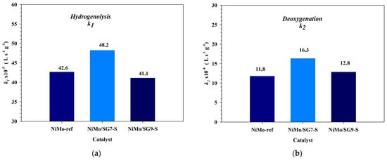 The impact of the impregnation pH on the activity of sulfided catalysts was analyzed in the hydroprocessing of soybean oil. The results for the hydrogenolysis (k1) and deoxygenation (k2) rate constants are summarized in Figure 7. In the first step, the NiMo/SG7-S catalyst exhibits the higher hydrogenolysis rate constant (k1), with a value of 48.2 × 10−5 Ls−1g−1, as shown in Figure 7a. This catalyst exhibits a K1 value 13% higher than the reference catalyst (42.6 Ls−1g−1). One can notice that the NiMo/SG7-S catalyst shows a k1 value 17% higher than the NiMo/SG9-S catalyst (41.1 × 10−5 Ls−1g−1). This result suggests that the presence of the Ni2+/Al2O3 species reduces the activity of the NiMo/SG9-S solid. On the other hand, deoxygenation rate constants (k2) exhibit values higher than those obtained in the hydrogenolysis step, as shown in Figure 7b. These results suggest that green diesel production is mainly controlled by the hydrogenolysis mechanism. Figure 7b shows that the NiMo/SG7-S catalyst exhibits the highest deoxygenation rate constant (k2), with a value of 16.3 × 10−4 Ls−1g−1. This value is even higher than the one observed for the NiMo/SG9-S catalyst (12.8 × 10−4 Ls−1g−1). In the deoxygenation step, the NiMo/SG7-S catalyst shows a k2 value higher than the one observed for the reference catalyst (11.8 × 10−4 Ls−1g−1), suggesting that the NiMo/SG7-S sample has the potential to serve as a catalyst in green diesel production.