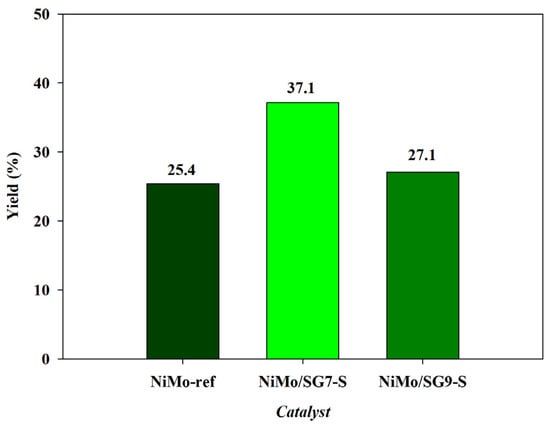 The green diesel yield of each catalyst is shown in Figure 8. The NiMo/SG9-S catalyst exhibits a similar yield (27.1%) to the reference catalyst (25.4%). However, the NiMo/SG7-S catalyst shows the highest yield value (37.1%). This result is consistent with the rate values observed previously.