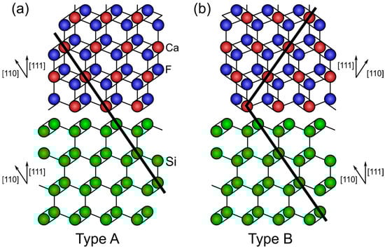 Schemes of the two distinct epitaxial relations at the CaF2/Si interface: (a) type-A orientation; (b) type-B orientation (adapted from Ref. []).