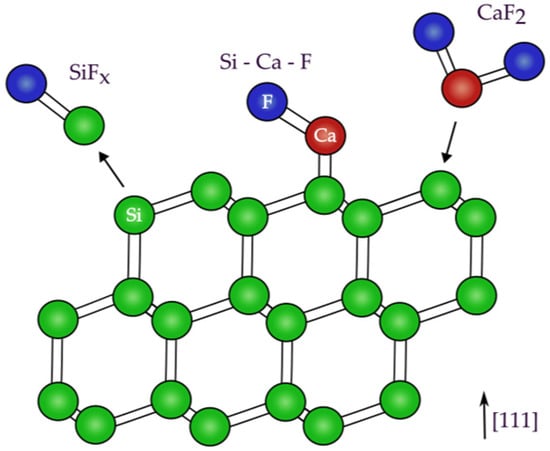 Beyond 600 °C, the thermal energy becomes high enough to drive an interfacial reaction which involves molecular dissociation and the formation of Si–Ca–F bonds. This causes the excess fluorine to be released as volatile SiFX species that escape from the surface (as shown schematically in Figure 2) []. This also favors the formation of a uniform reacted layer that wets the substrate. If the growth temperature is below 600 °C, however, the thermal energy is not sufficient to induce this interface reaction; at around 470 °C, scanning tunnelling microscopy (STM) has demonstrated intact Si regions between 3D CaF2 islands [], while at room temperature the formation of single-crystalline layers of CaF2 is inhibited []. These results have also been confirmed by photoemission studies based on surface sensitive core-level spectroscopy [,].