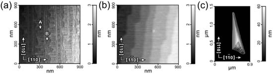 Similarly, MBE-grown SrF2 on Si was studied in [], focusing on the interface formation. The results closely resembled the CaF2 case []: at high deposition temperatures (700–750 °C), Figure 5a shows that SrF2 formed reacted nanostripes running along the [110] or [ directions (labeled B and A, respectively). When reaching 1 ML, the nanostripes coalesced into a uniform wetting layer (Figure 5b); for 2–20 ML, 3D islands nucleated on top this interfacial layer (Figure 5c). During the development of the wetting layer, photoemission studies indicated a molecular dissociation and the formation of Sr–Si bonds. At lower deposition temperatures (around 400 °C), flat triangular SrF2 islands formed without covering the entire surface.