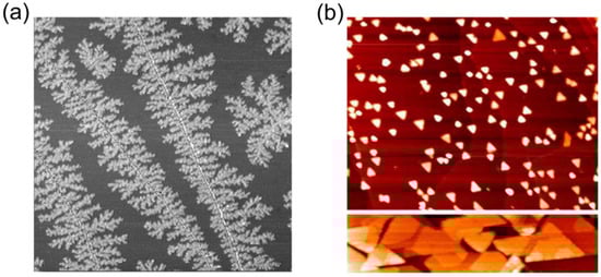Farías et al. [] deposited epitaxial LiF on Ag at low temperature; the first growth stages were investigated through scanning tunnelling microscopy (STM). Performing the deposition at 77 K, it was observed that the fluoride molecules nucleated on both the upper and lower sides of step edges (Figure 6a); this contrasted with metal-on-metal growth, where nucleation typically occurs only on the lower step side. This behavior was attributed to the presence of a strong local electric fields due to charge redistribution at the step sites and parallel to the surface [,].