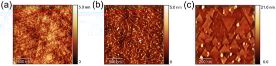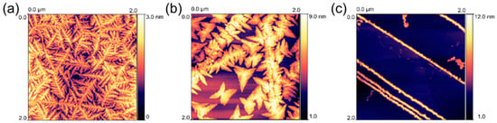 AFM images of SrF2 growth on HOPG: (a) 5 nm of SrF2 at RT; (b) 5 nm of SrF2 at 200 °C of substrate temperature; (c) 5 nm of SrF2 at 400 °C of substrate temperature (reprinted from Ref. [], Creative Commons CC-BY license. Copyright (2024) by Elsevier).