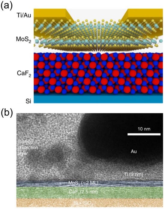 (a) Atomistic structure of the quasi-vdW interface between F-terminated CaF2 and MoS2. (b) High-resolution TEM image obtained in the channel area (reprinted from Ref. [], Creative Commons CC-BY license. Copyright (2020) by Springer Nature).
