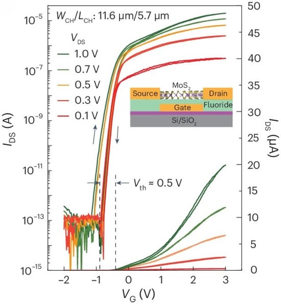 Static transfer characteristics of n-type MoS2 transistors, with a LaF3 thickness around 100 nm, measured at room temperature with a sweep rate of 100 mV s⁻1, shown for various VDS values (reprinted, with permission, from Ref. []. Copyright (2024) by Springer Nature).