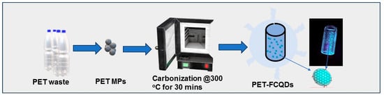 Disposable water bottles made of commercial-grade PET were used as the source material to obtain the microplastics (MPs) required for CQD synthesis. The preparation of PET MPs has been thoroughly detailed in previous studies [20]. PET-derived fluorescent carbon quantum dots (PET-FCQDs) were synthesized using a simple, one-step pyrolysis method (Figure 1).